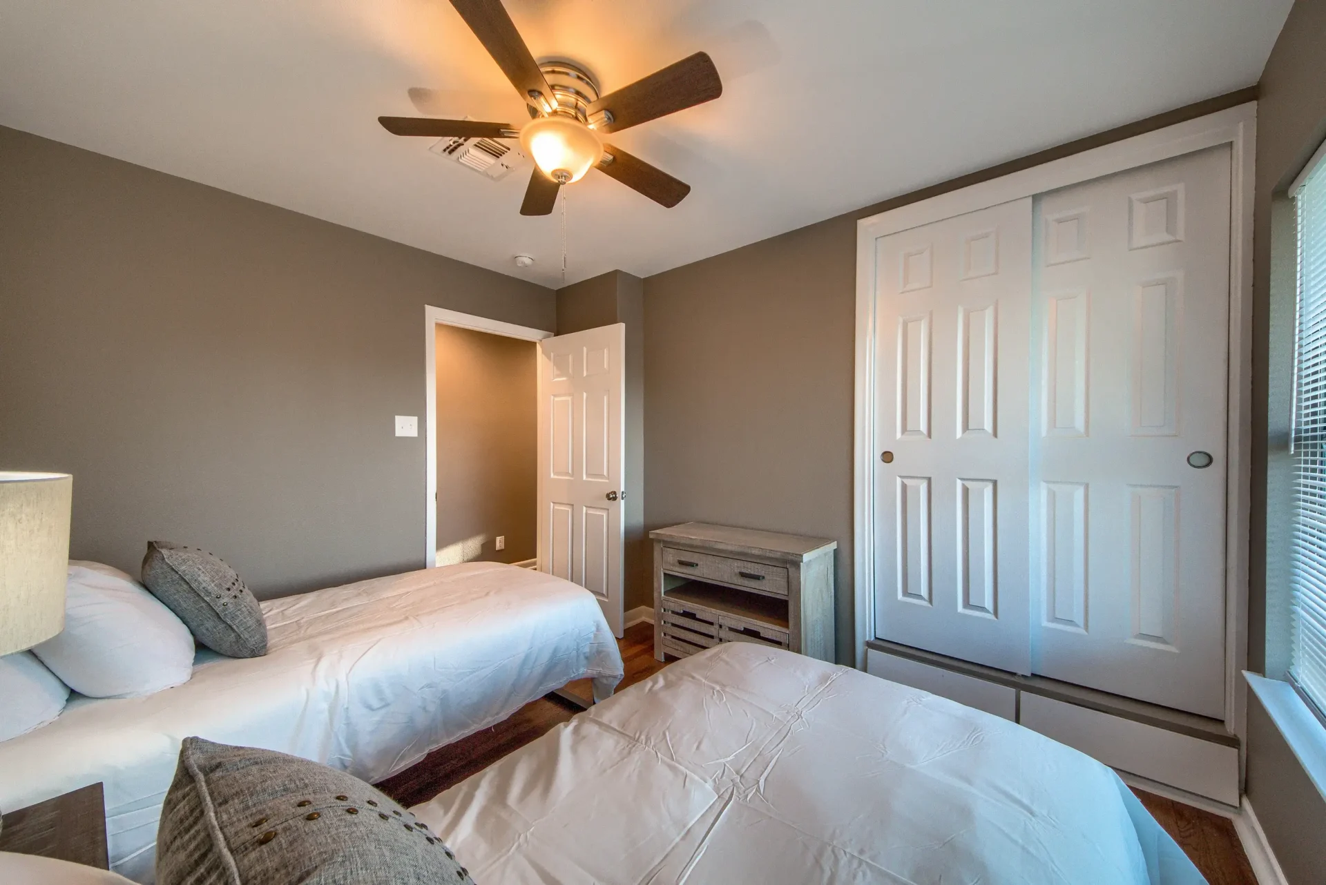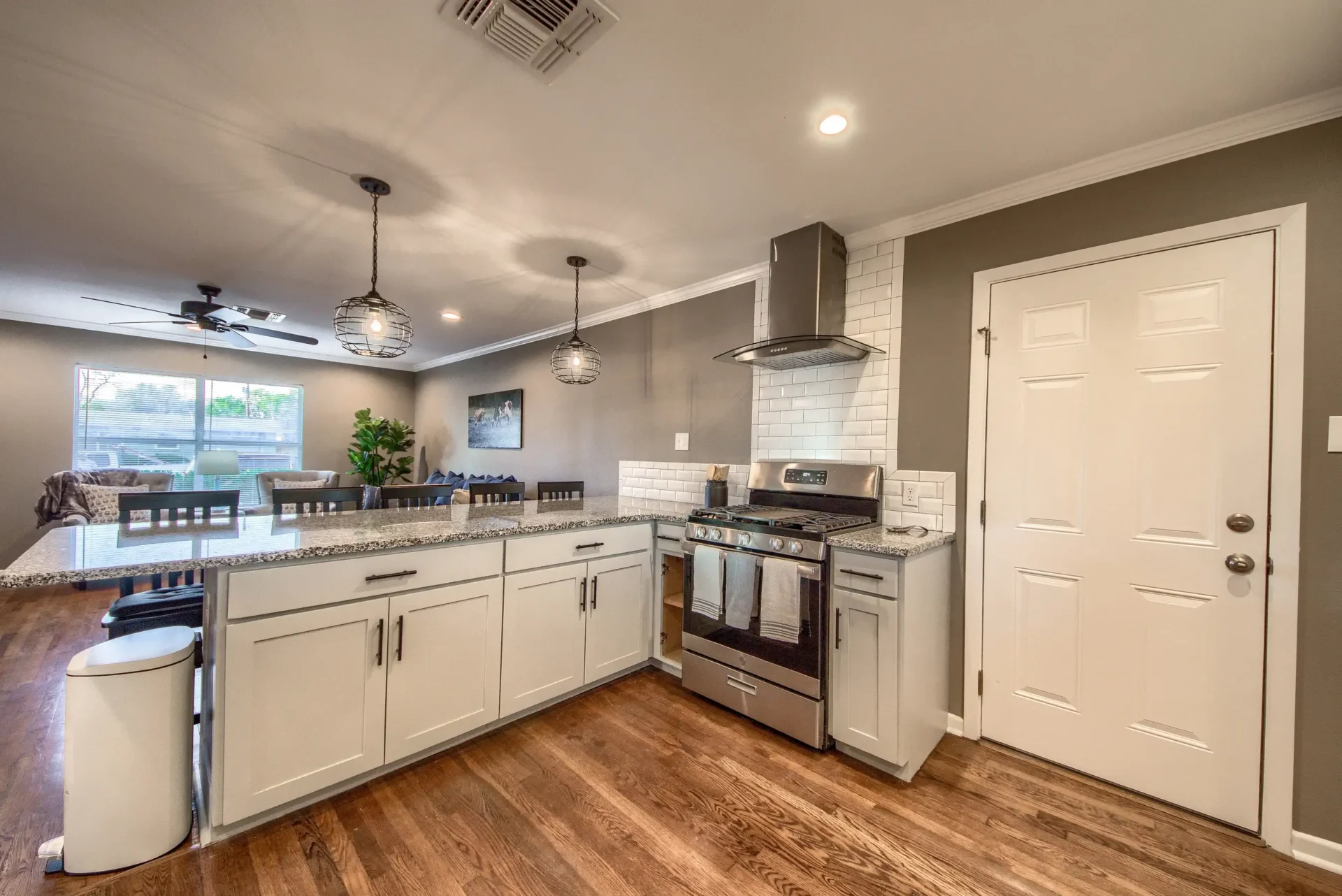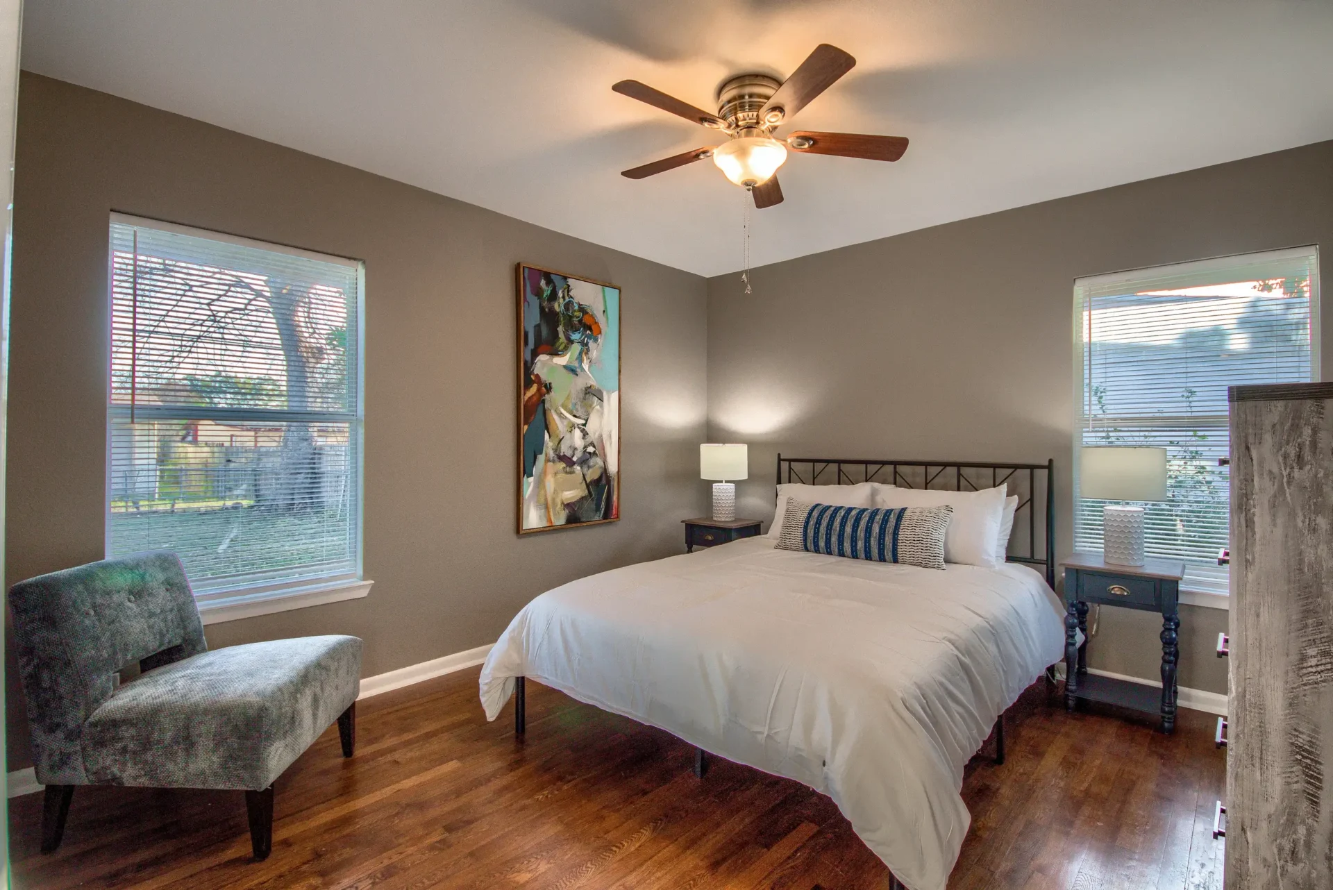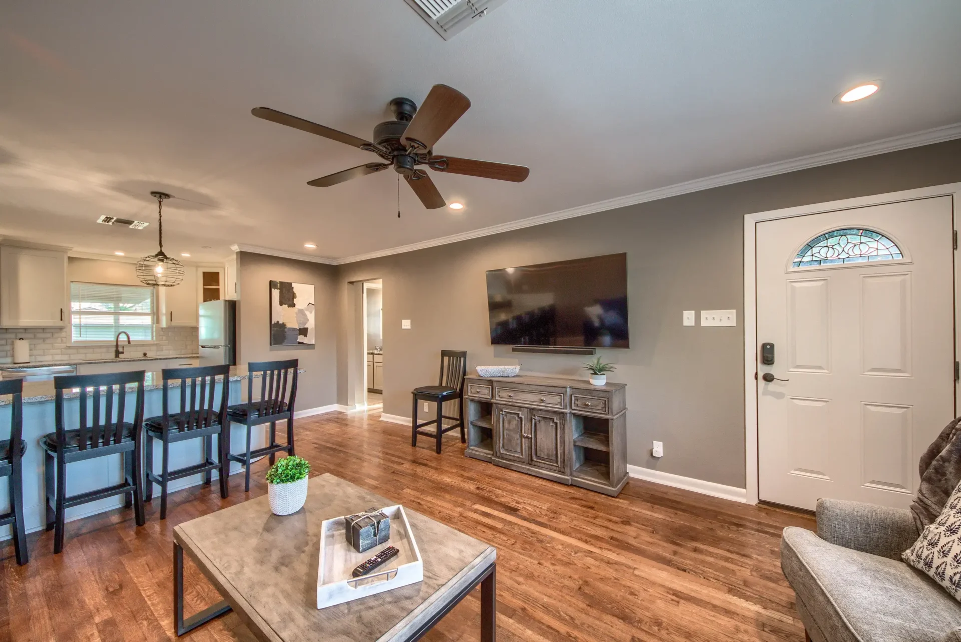 This is an updated mid-century family home. You will notice the open concept in the living area–kitchen. The beautiful peninsula with bar stools adds a welcoming touch. The house has a stocked kitchen, linens, towels, Ring cameras, fiber internet, stainless steel appliances, and ceiling fans. The fenced backyard, with its back porch, is tastefully landscaped. Two of the bedrooms have queen-sized beds and one bedroom has two twin beds. The property has a full-size washer dryer and one-car garage.