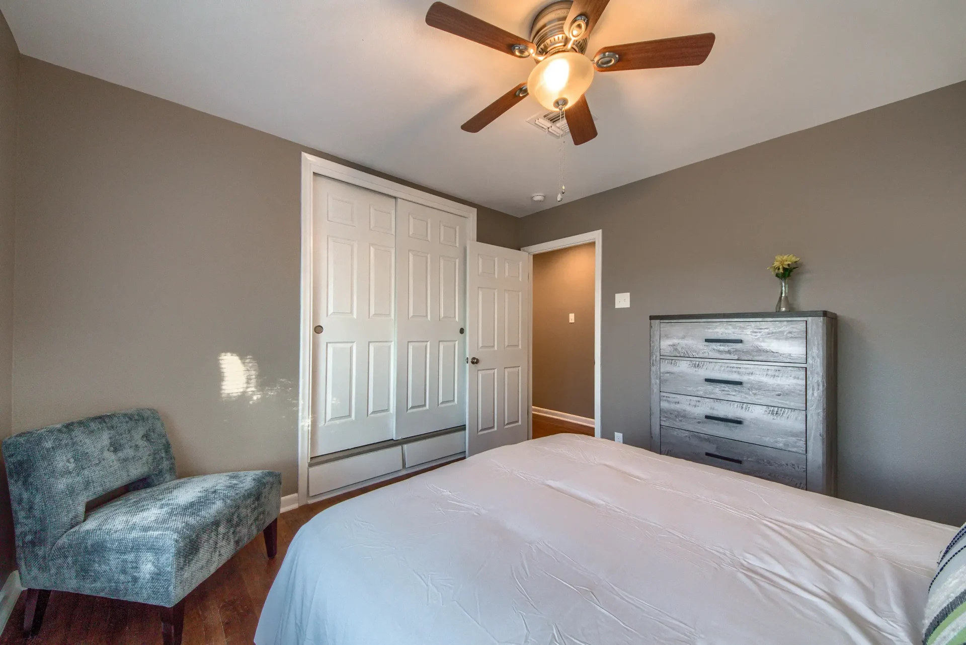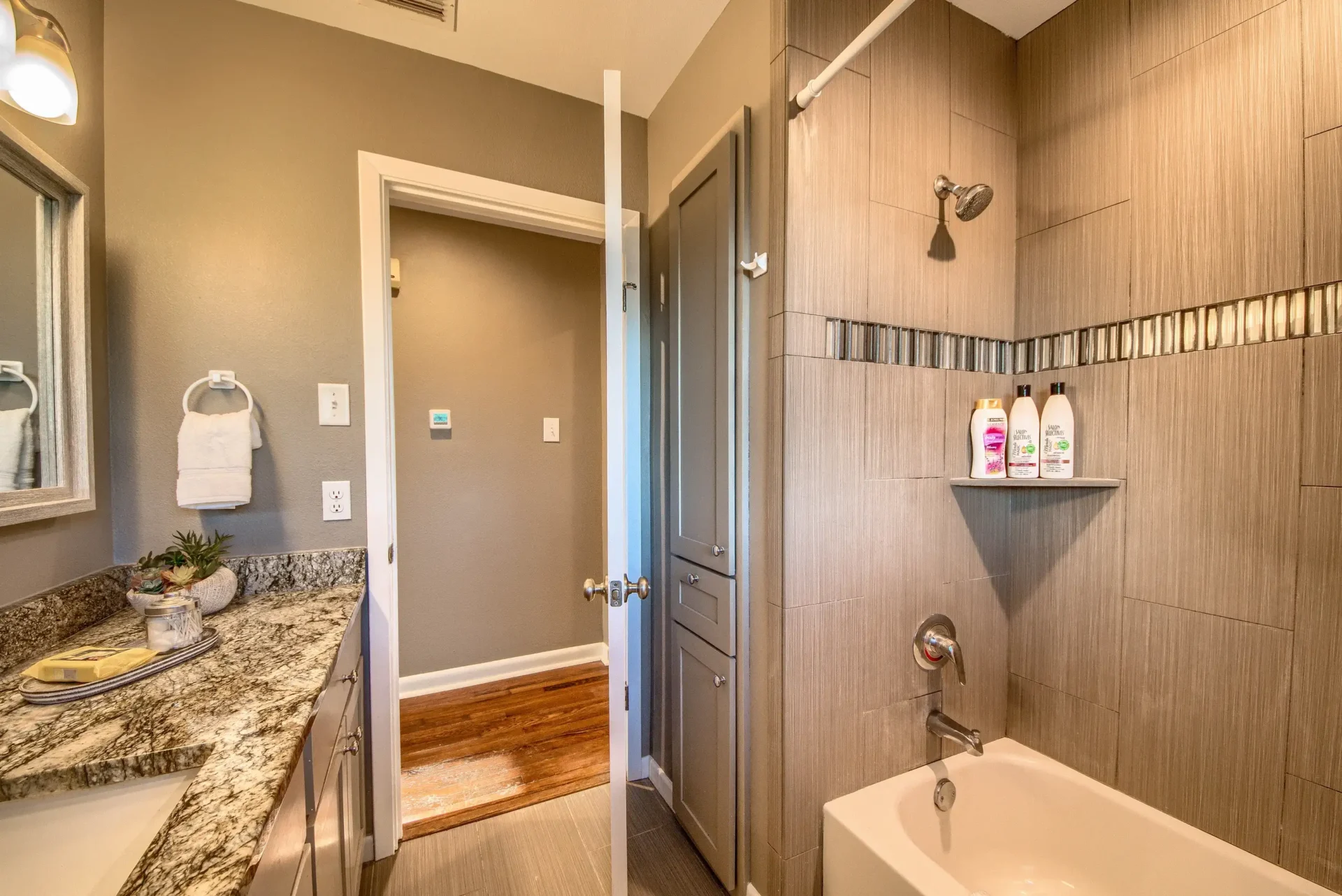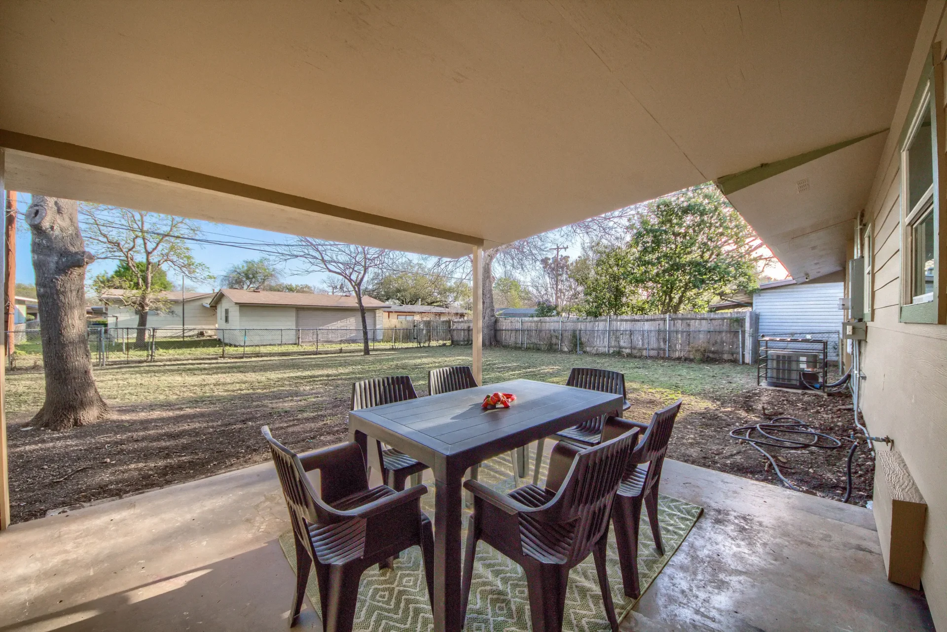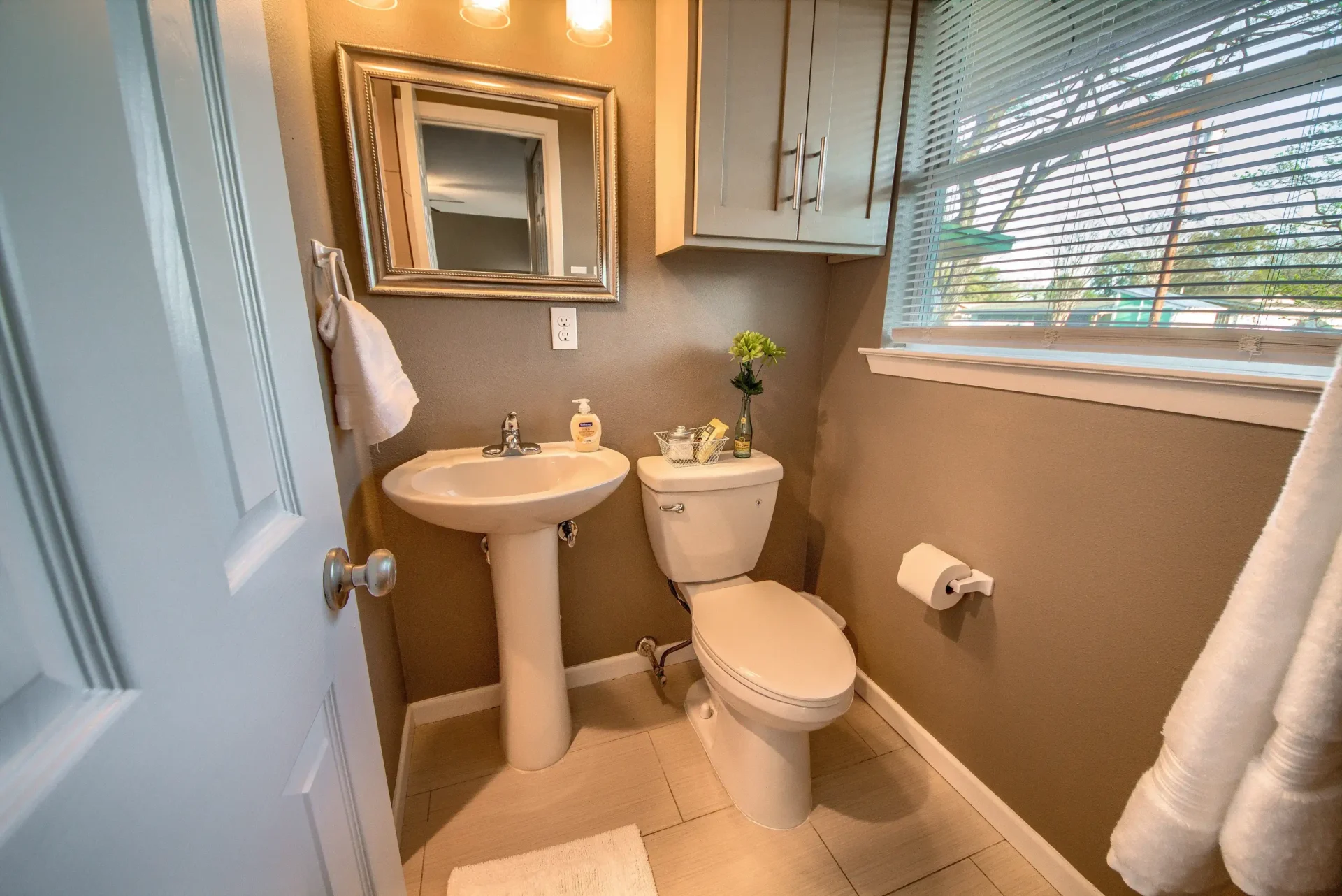 This is an updated mid-century family home. You will notice the open concept in the living area–kitchen. The beautiful peninsula with bar stools adds a welcoming touch. The house has a stocked kitchen, linens, towels, Ring cameras, fiber internet, stainless steel appliances, and ceiling fans. The fenced backyard, with its back porch, is tastefully landscaped. Two of the bedrooms have queen-sized beds and one bedroom has two twin beds. The property has a full-size washer dryer and one-car garage.