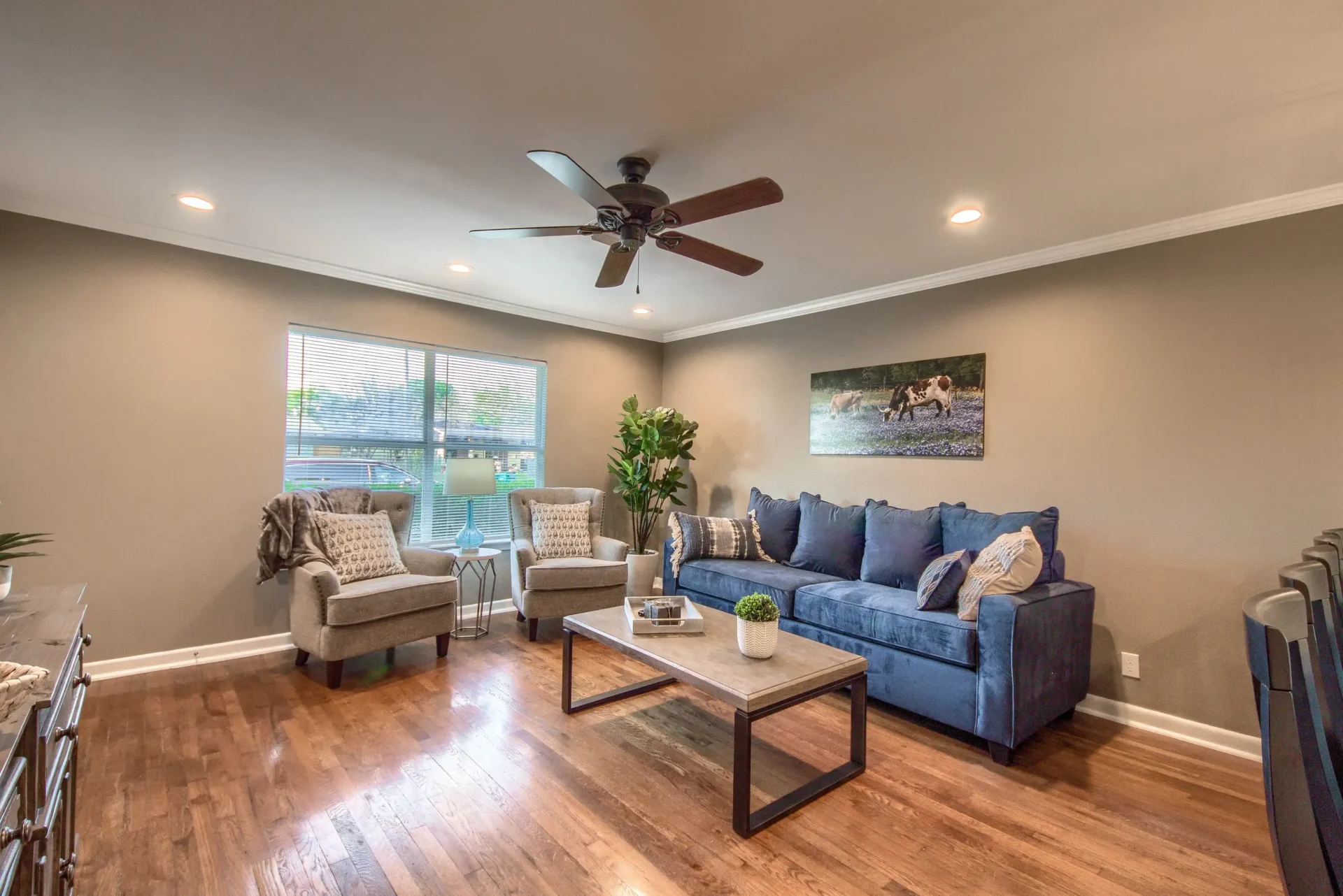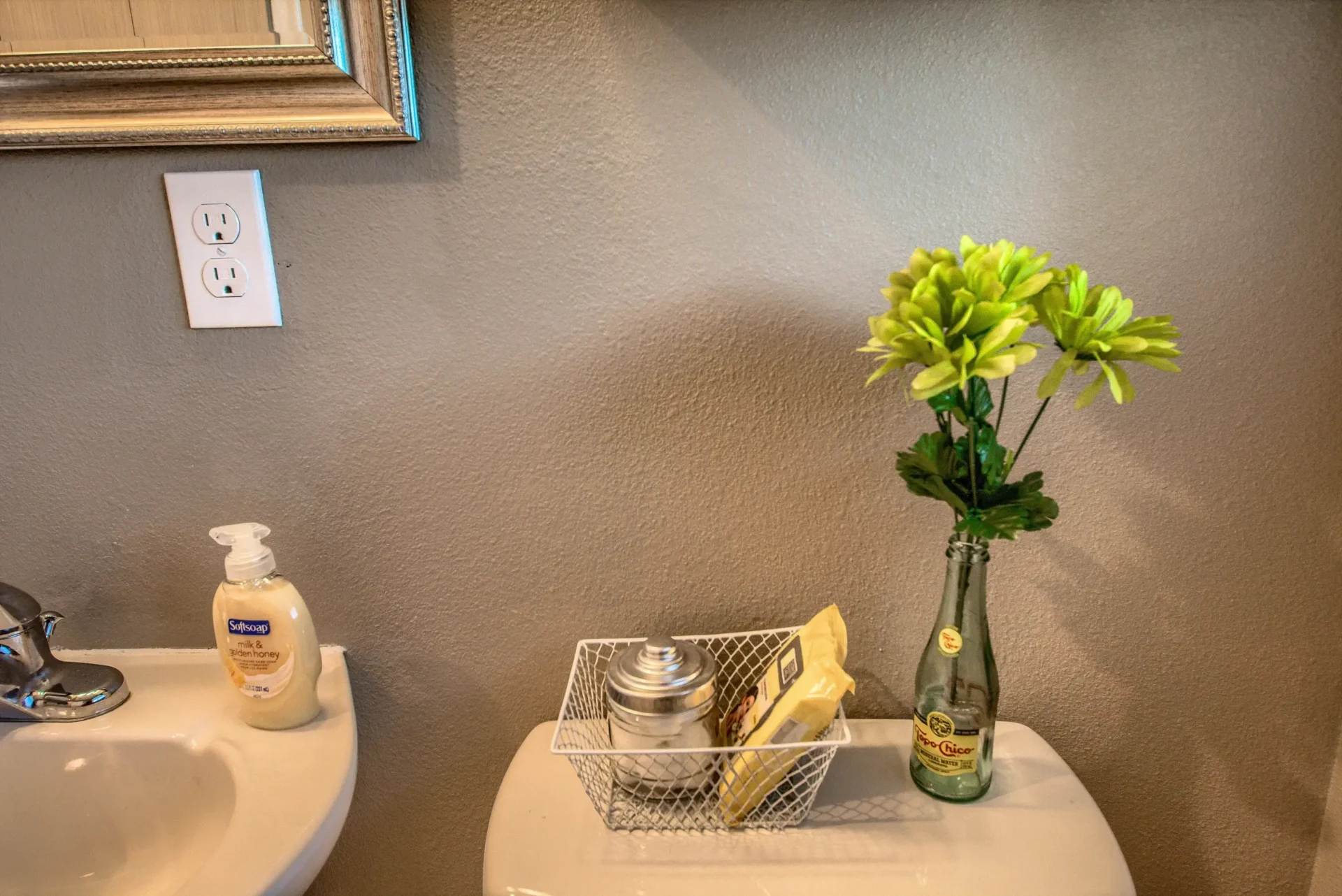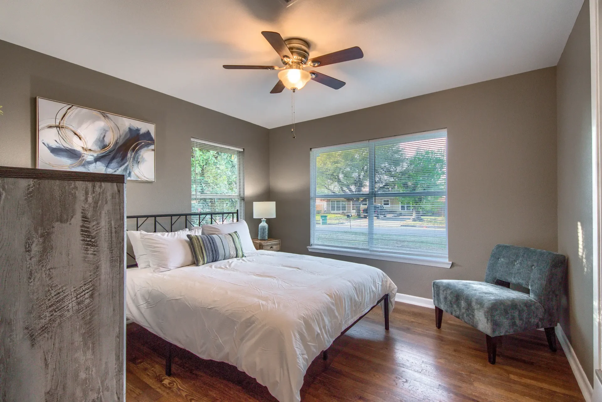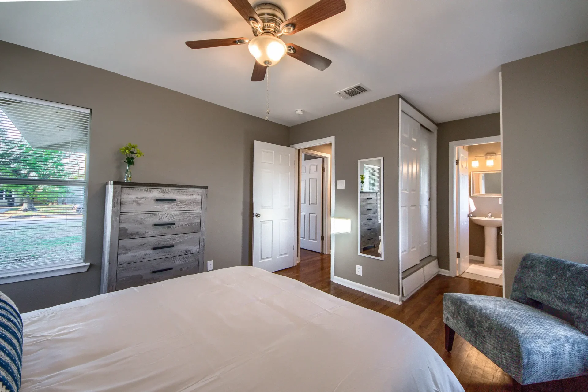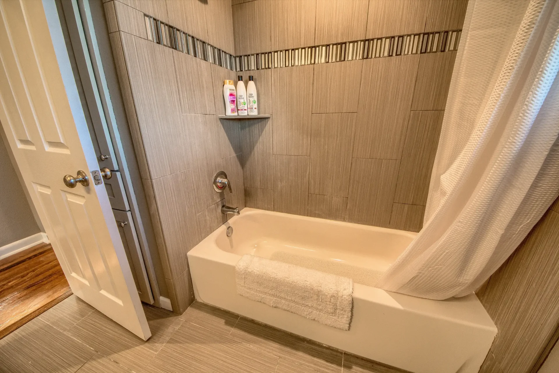 This is an updated mid-century family home. You will notice the open concept in the living area–kitchen. The beautiful peninsula with bar stools adds a welcoming touch. The house has a stocked kitchen, linens, towels, Ring cameras, fiber internet, stainless steel appliances, and ceiling fans. The fenced backyard, with its back porch, is tastefully landscaped. Two of the bedrooms have queen-sized beds and one bedroom has two twin beds. The property has a full-size washer dryer and one-car garage.