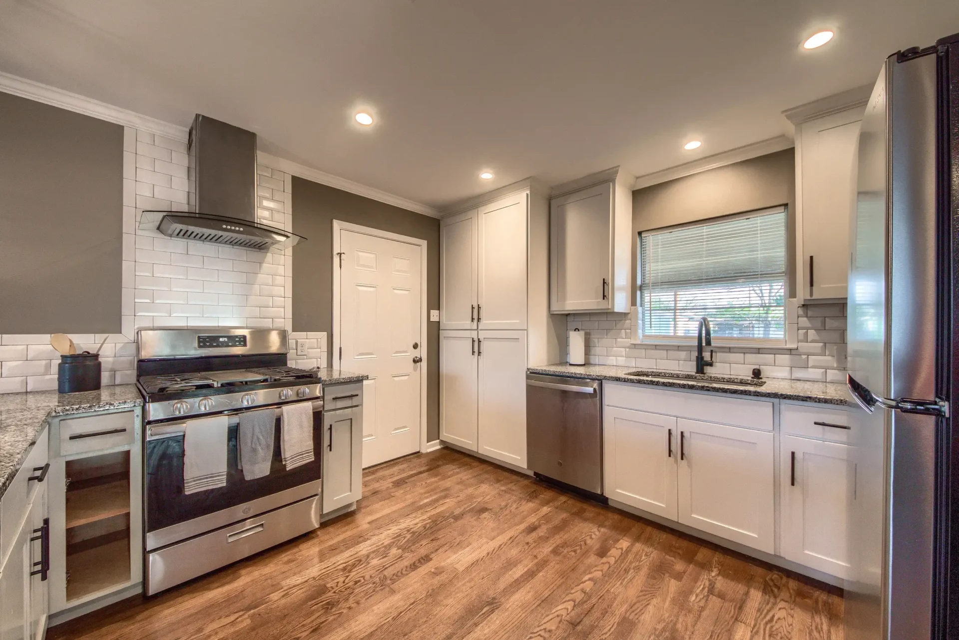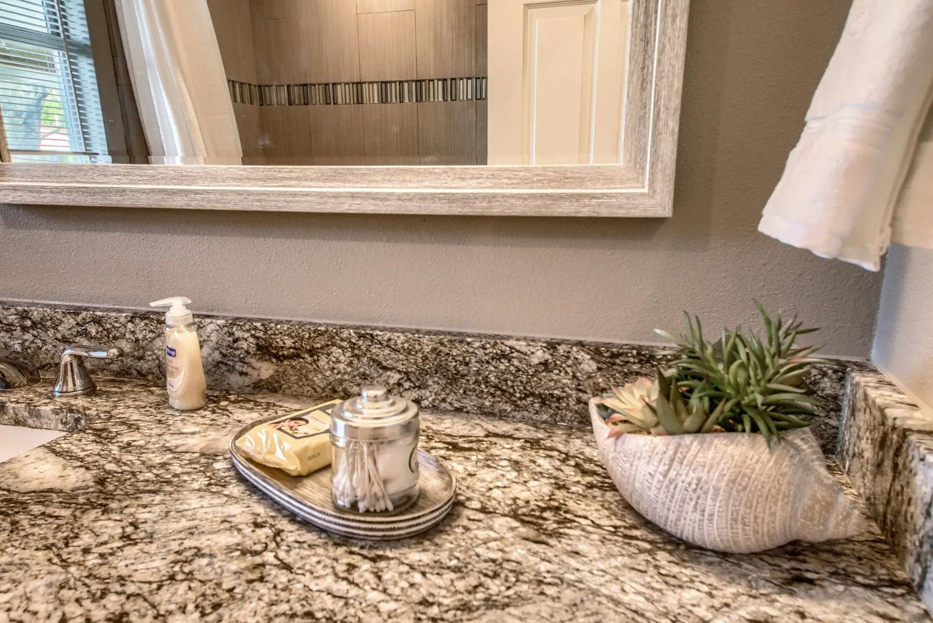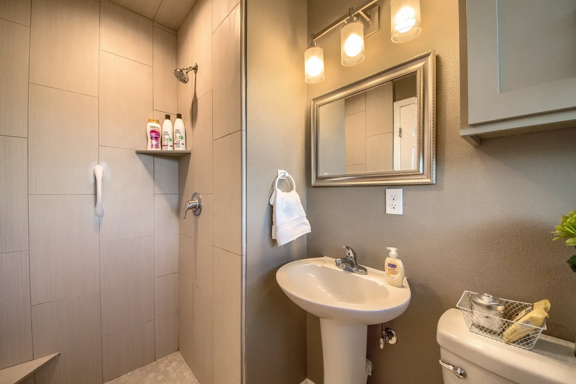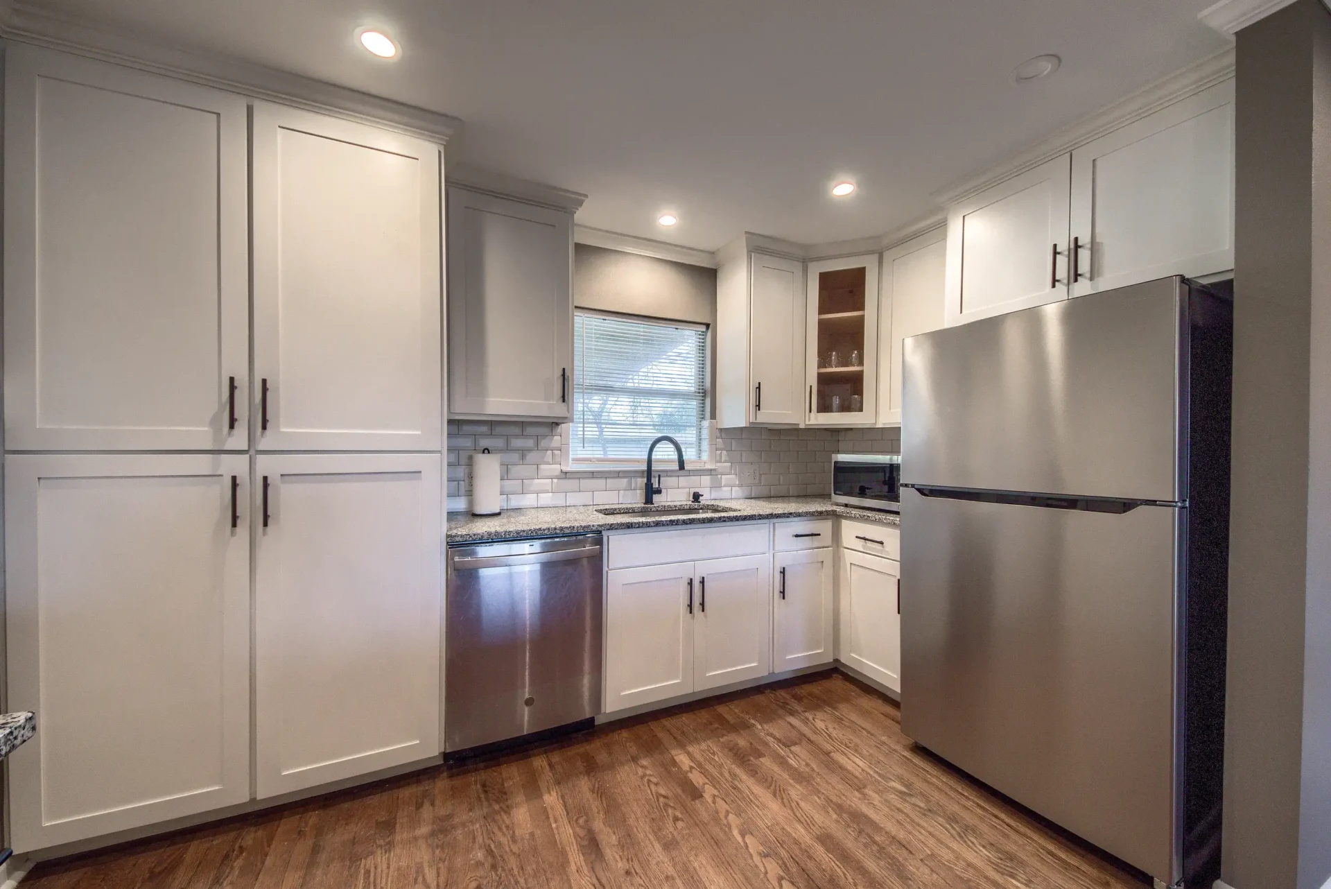 This is an updated mid-century family home. You will notice the open concept in the living area–kitchen. The beautiful peninsula with bar stools adds a welcoming touch. The house has a stocked kitchen, linens, towels, Ring cameras, fiber internet, stainless steel appliances, and ceiling fans. The fenced backyard, with its back porch, is tastefully landscaped. Two of the bedrooms have queen-sized beds and one bedroom has two twin beds. The property has a full-size washer dryer and one-car garage.