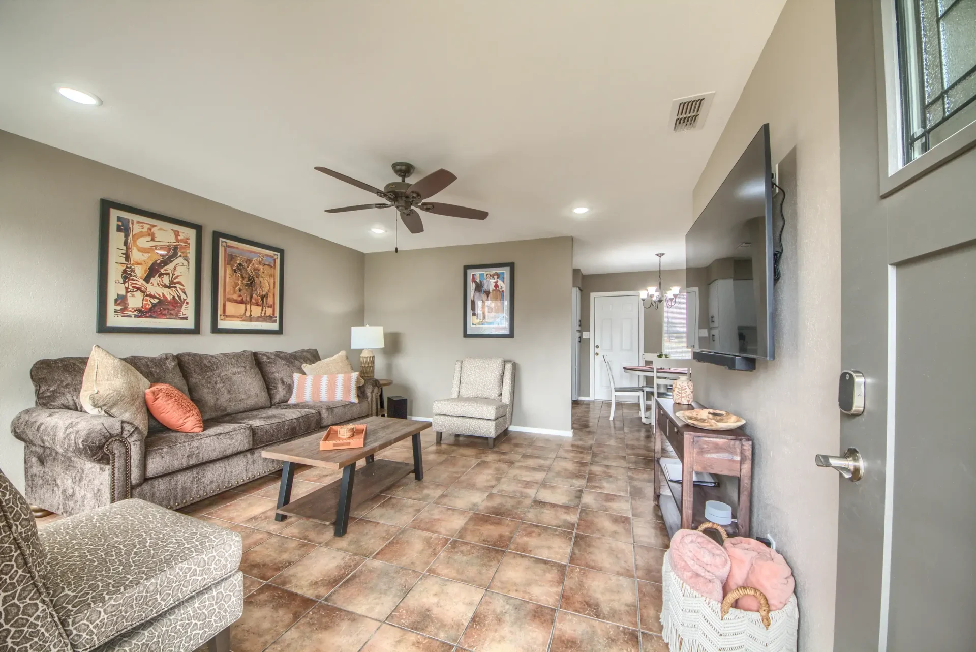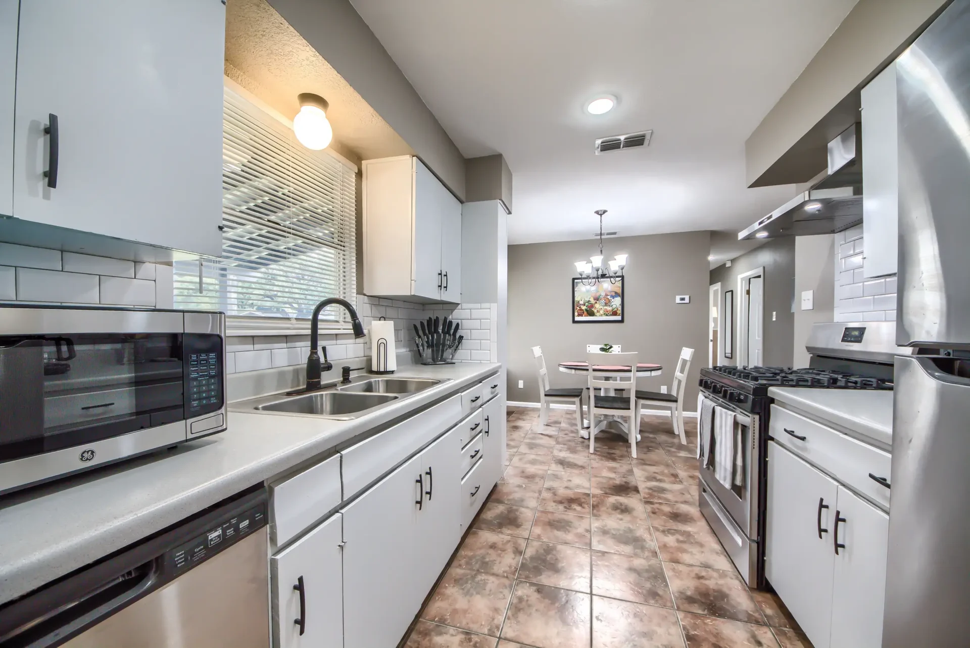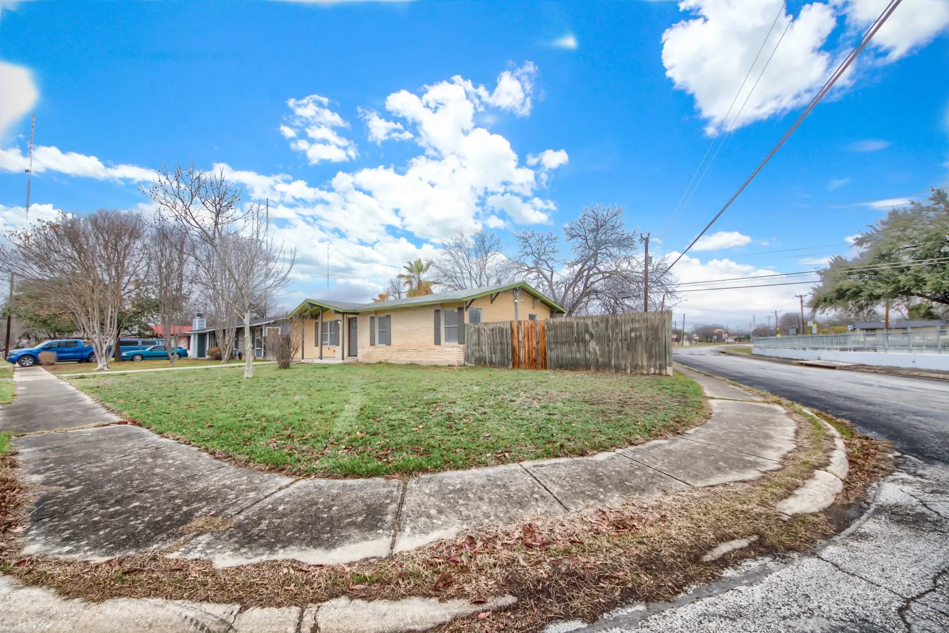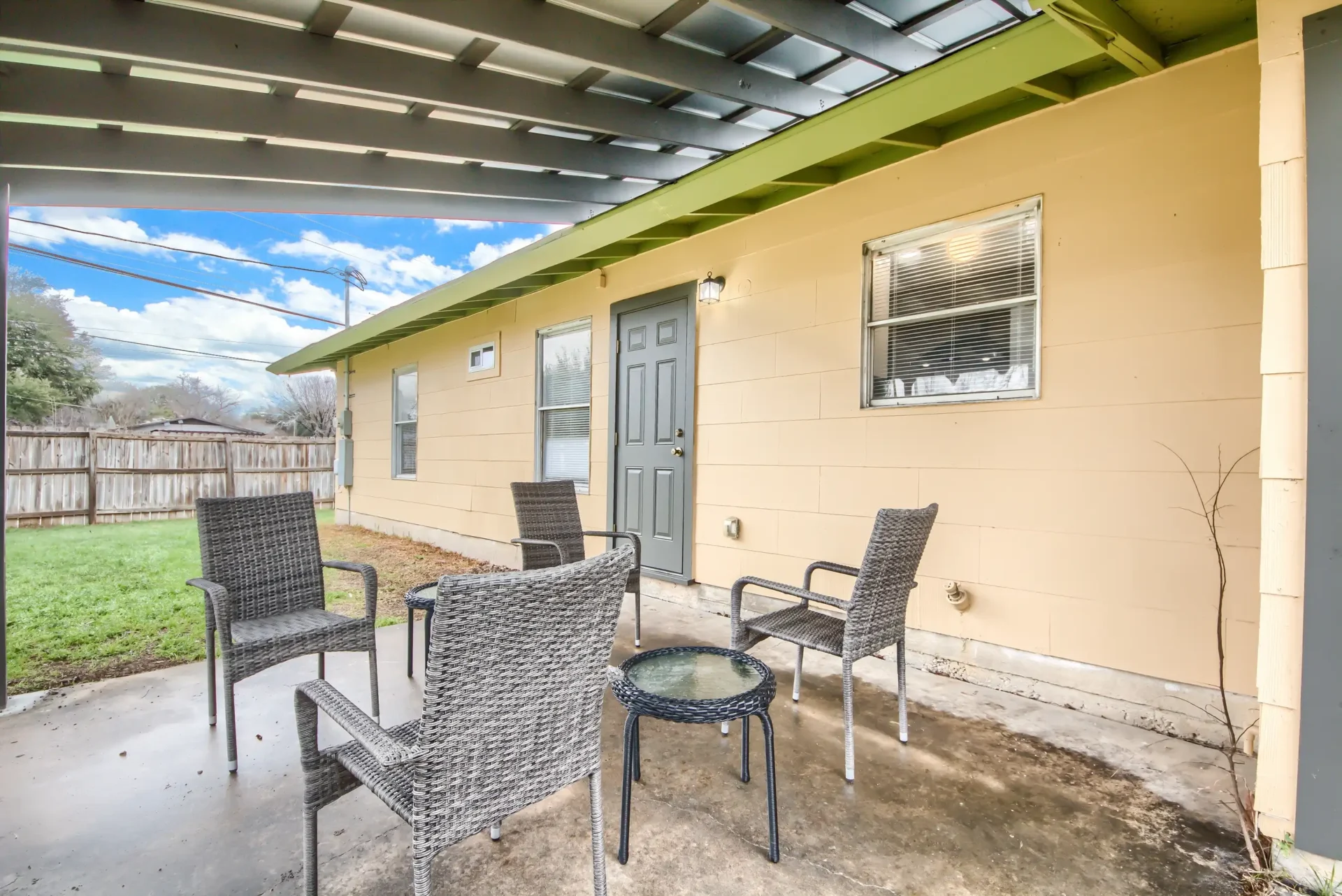 This mid-century updated two-bedroom one-bath home has a one-car garage with an opener. The fiber internet allows for easier access. It is situated on a large corner fenced lot. You are very close to Fort Sam Houston and San Antonio Army Medical Center. Randolph Air Force Base is nearby on IH 35. The house possesses a dedicated office with desk and chair, an open floor plan with an eat-in kitchen. Both bedrooms have queen size beds and ceiling fans. You will appreciate the multiple closets and storage. The house has a stocked kitchen, linens, and towels. The full-size washer dryer are in the house and the kitchen has stainless steel appliances.